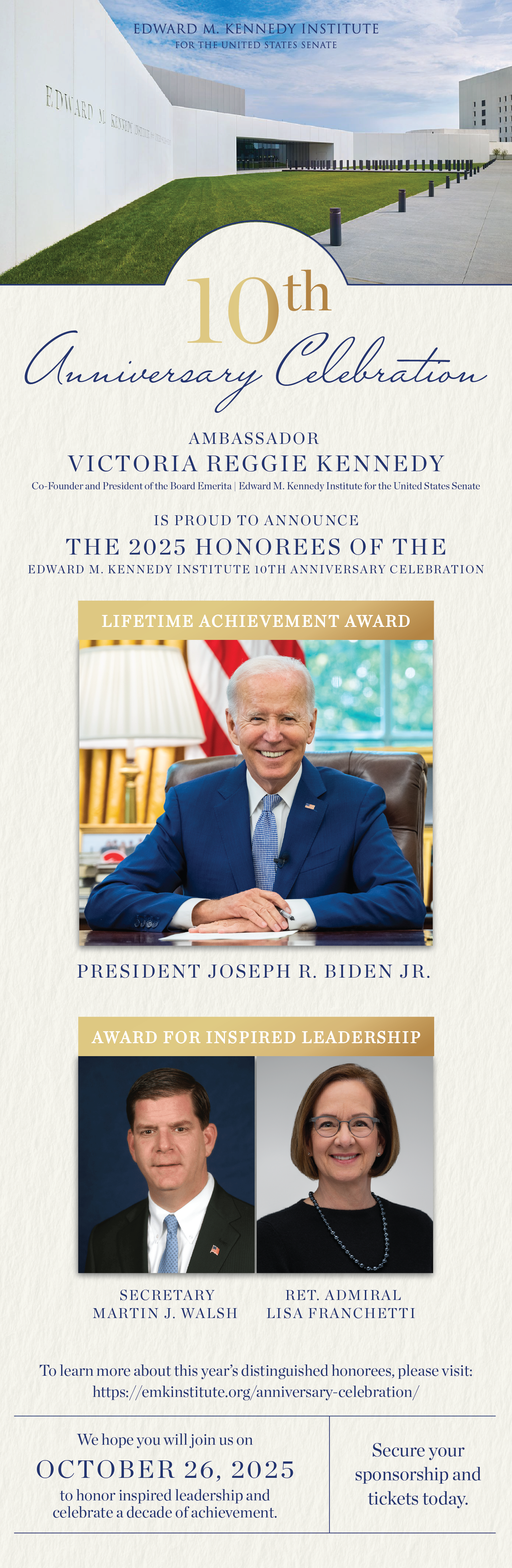 Thank you for supporting the Edward M. Kennedy Institute 10th Anniversary Celebration on Sunday, October 26th. We welcomed 520 guests to celebrate this anniversary milestone and honor our distinguished award recipients – President Joseph R. Biden, Secretary Martin J. Walsh, and Retired Admiral Lisa Franchetti.
